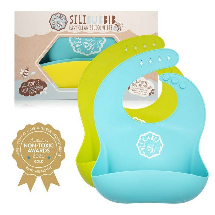 Peekabee Silicone Bibs Set of 2 + Bonus Spoon (Baby & Toddler)