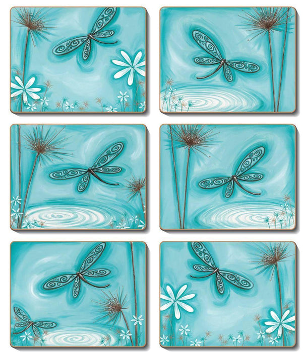 Cinnamon Blue Dragonfly Dreams Coasters – Set of 6 | Large Cork Coasters Gift Boxed by Lisa Pollock